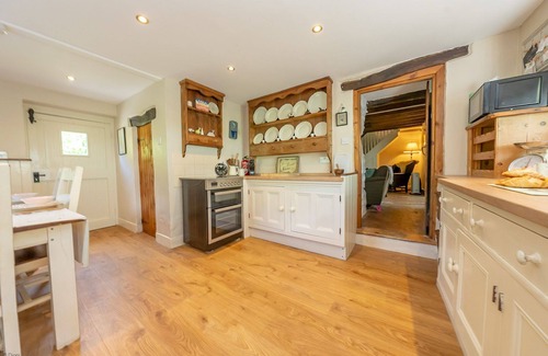 The lounge next door is equally spacious with two large sofas flanking a warming log burner set within the original inglenook fireplace. Exposed beams and whitewashed stone walls are complemented by more modern lighting and a flat screen TV. The adjoining conservatory is a great space to escape to on warm summer evenings.