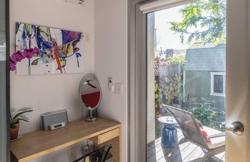 A separate entrance is a portal to a luxurious self-contained modern cottage in a secluded walled garden. Sliding glass pocket doors look over the lily pond and hummingbirds. The tree-shaded bedroom has cork floors for quiet comfort and a sliding wood panel door. The bathroom has a shower with floor to ceiling frosted windows, and there is a private rear deck. This contemporary modern suite features vibrant colors and artwork throughout. We provide fragrance free soaps and cleaning supplies and HEPA AIR FILTRATION 24HRS.