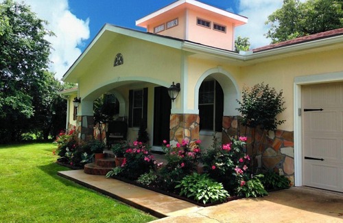 Experience the allure of a charming farmhouse turned bungalow in Fayetteville. Originally built in 1952, this serene abode now rests on 5 picturesque acres, offering an idyllic country ambiance within city limits. With a Mediterranean-inspired facade featuring stucco, stone, a cupola, and elegant arches, this home exudes timeless beauty. Nestled among majestic oak trees, this colorful, clean, and cozy retreat promises a truly rejuvenating stay.