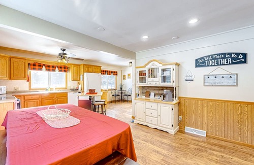Situated on one and a half acres, delight in the tranquil settings of a quiet neighborhood. Feel right at home while grilling in the spacious yard while everyone unwinds on the patio, playing yard games, and soaking up some sun. When evening approaches, gather around the fire pit for s’mores under the stars. Inside you’ll discover an open-concept living area bursting with plush seating and plenty of charming, rustic decor. Snuggle up on the sofa to stream your favorite movies or break out the board games in the downstairs lounge space. A full kitchen boasts modern appliances and ample storage for effortless food preparation. Create delicious home-cooked meals with ease. After a full day of excursions, utilize the private washer/dryer for any gear, and retreat to the inviting bedrooms - complete with soft, cozy linens and artful, wooden accents to ensure ultimate comfort every moment of your stay.