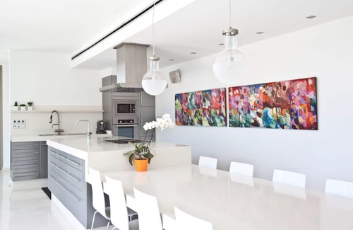 Interior Features The spacious and modern interior living spaces follow the same clean, white aesthetic as the exterior, offering a sleek, contemporary design. Large family living room at pool level includes satellite TV and a real fire, making it the perfect space for socializing or relaxing. Modern kitchen on the first floor opens onto a sun terrace with an outdoor dining area, perfect for al-fresco meals. A formal interior dining space seats eight and is designed with style and functionality in mind.