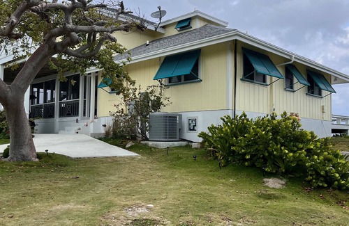This beautiful beach home is newly-renovated (thank you to hurricane Dorian), with a custom kitchen and cozy seating area. If you enjoy relaxing at home in the air conditioning with gorgeous views this is the spot for you! Did we mention there’s an onsite hot tub! Talisman runs fully off of solar power but don’t worry there is a back up generator just for peace of mind.
