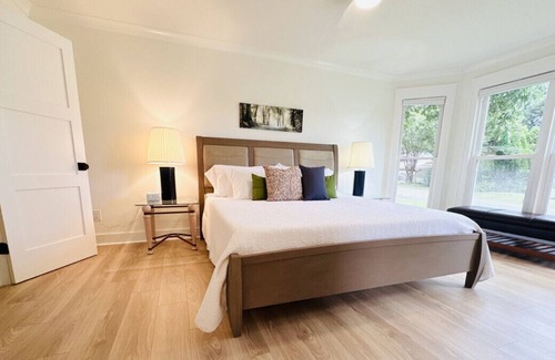The master bedroom boasts of a large king sized bed and wall to ceiling windows to capture the crisp morning sun. Have your choice of 2 queen beds in the other guest rooms. The kitchen is perfect for a family wanting to cook great meals in the neat and spacious kitchen with chic stainless steel appliances. Head out to the back yard to enjoy roasting marshmallows out on the fire pit with rustic wood seating. Enjoy the peaceful and serene neighborhood as you call this beautiful rental your next temporary home!