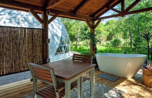 Privacy - the domes were designed to provide privacy and a unique interaction with nature. The domes range anywhere from 80 feet to 250 feet apart, but even the ones with only 80 feet between them have a buffer of trees and shrubs, affording privacy. Each dome’s social area is on the opposite side of the other, providing additional privacy.