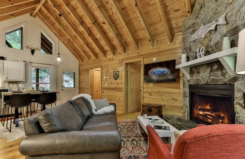 The living room has a with wood-burning fireplace (a starter bundle offirewood provided Oct. 1st- April 1st ), 55" SmartTV Hulu provided