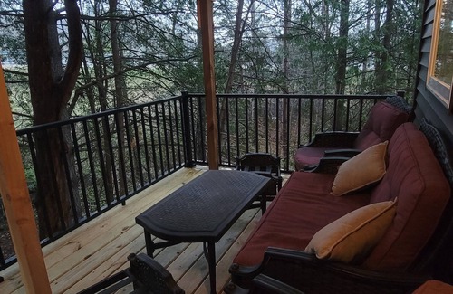 Enjoy driftless woodland valley views from this "reimagined rustic", one-room,12 by 16 foot cabin on posts in the trees. Perfect for guests looking for a camping / glamping experience but prefer lodging accommodations. Linens and towels provided. Corner bunk with 3 twin mattresses. Couch converts to a full bed.Heat, A/C, wi-fi, mini fridge, microwave and coffee pot. Hanging hammock chairs outside underneath the cabin. Private firepit with cooking grate and 4 chairs. Shared outdoor seating areas and gas grill. Cabin does not have plumbing. Year-round heated bathhouse with hot water, showers, toilets and drinking water available within 50 feet. Hiking trail and woodland areas to explore on the 14-acre property. Firewood is available for purchase on site.This unit is one of three treehouse cabins available on the property.