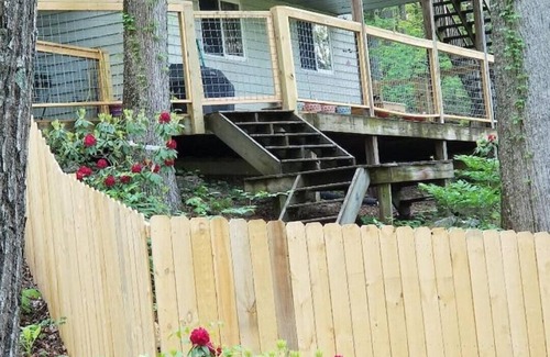 House (5+ days) Large, sunny open floor plan, huge windows, dramatic high beamed ceilings and beautiful views! Hiking trails on property - one to fire tower! Rivers, waterfalls, mountain vistas nearby, 30 minutes to Asheville, NC and Tennessee. Large fenced yard, fire pit. Two driveways/upper and lower level entrances. Two full bathrooms - one with tub, master has a walk in shower with seat. Washer and dryer, sliders to upper large deck, lower covered deck. Hilltop - trees all around!