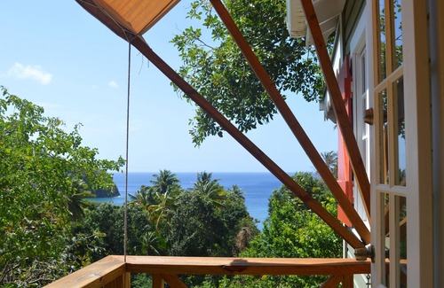 Outside the roofed deck gives you space to relax or dine with a beautiful view of the Caribbean Sea just 100 yards away. The trees surround you with nature and give you a feeling of seclusion. The deck is perfect to watch the birds and overlook the pelicans in the bay diving for fish. Every morning you wake in the four poster bed to watch the sailing boats cross the bay on their way to Guadaloupe. The cottage overlooks a sweeping canopy of almond and palm trees down to the coastline just 100 metres away. In the evening you can relax and watch the sunset and then later open the awning on the balcony to star gaze in the night sky. As you can imagine it is a very special place to stay.