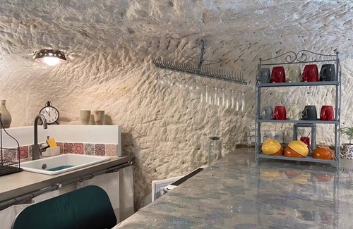The troglodyte house consists of a main room divided into two areas: a dining area with a fully equipped kitchen and a cozy bedroom area (2 people) with a fireplace. The second room includes a bedroom area (2 people), a living area with a bed (1 person), a breakfast/apéritif corner, and a bathroom with toilet and washing machine. The bedroom areas are located at the back of the rooms and are separated by a curtain.