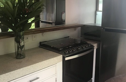 There are about 25 stairs down to the house from the street. The kitchen is equipped so you can cook if you are in the mood or there are many good restaurants close by. Inside the house is a king size bed, lockable walk in closet, desk (WiFi speed is 155) and sitting which are air-conditioned and have sliding glass windows and screens.