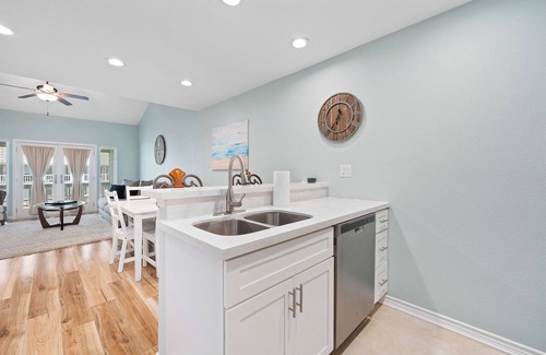 Inside, the open-concept living and dining area is filled with natural light and coastal-inspired decor, creating a relaxing and inviting atmosphere. The fully equipped kitchen features modern appliances, making it easy to prepare meals and snacks during your stay. Whether you’re dining indoors or out on the balcony, you’ll always have a view worth savoring.