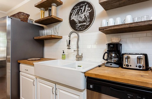 This charming home delivers modern farmhouse style and comfort, centrally located within walking distance to Austin's most beloved attractions. Featuring 4 Bedrooms (2 in the main house + converted attic & 1 in the detached guest house) + 2 bathrooms (1 in the main house & 1 in the guest house) and can sleep 10 guests. Stroll along to Zilker Park, Palmer Events Center, Auditorium Shores, Congress Bridge, SOCO district, South 1st for restaurants, nightlife and shopping. Enter Lady Bird Hike and Bike Trail across Barton Springs Rd., just through the lovely Butler Park complete with a splash pad for our warmer months. The common spaces are ideal for quaint conversation, enjoying friends and family. Renovated and functional kitchen, open to living area and dining provides all essentials. Lovely, new furnishings, cushy linens and cozy beds. Various patio/ deck offerings, outdoor dining and grill. Included guest quarters at the rear of the property presents a private space, bathroom and kitchenette with exquisite vintage appeal!