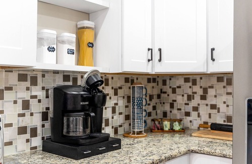 Cook with ease in the beautiful open-concept kitchen, fully stocked with all the essentials—Keurig and drip coffee maker, toaster, blender, mixer, bakeware, cookware, dishes, and glassware.