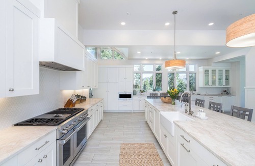 The main level boasts a luxurious primary suite complete with a KING-SIZE BED, a spacious ENSUITE BATHROOM, and a private OFFICE space—ideal for guests who need to work during their stay. On the lower level, you'll find five additional bedrooms: three with KING-SIZE BEDS, one with a QUEEN-SIZE BED, and a BUNK ROOM with a TWIN-OVER-TWIN BUNK and an extra TWIN BED. These bedrooms share three beautifully appointed BATHROOMS, ensuring all guests enjoy privacy and comfort.