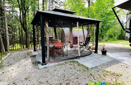 Our space is pet friendly with restrictions (please see rules or inquire). We have aircraft cable connected to trees with snap hooks so you can easily connect your dog's harness or collar. The local bylaw requires all dogs to be on leads or leashes outdoors. We also have poop bags in case you forget yours or run out. Our outdoor space also has a hammock for you to absorb the sun or take in the stars. Our BBQ is under a lit gazebo, and we provide an outdoor table with chairs. There is also a large bonfire pit with Muskoka chairs where you can enjoy a nice bonfire and make some smores; we also have marshmallow roasting sticks. A local burn ban is in effect; no burning before 7:00 PM.