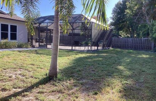 If you’re ready to relax, enjoy this spacious and bright three bed two bath retreat in the screened in pool while grilling on your huge lanai .Ceiling fans keep you comfortable while you lounge by the pool with tables and lounge chairs floats boogie boards and pool toys for the kids keep them laying in the sun for hours. Or eat in your fully equipped kitchen with stainless steel appliances, toaster, blender, waffle, iron, crock pot, coffee, maker, electric skillet equipped with a child seat. Enjoy the free Wi-Fi on your 75 inch smart TV also TVs and every bedroom. Three entrances to the pool allow you to enjoy water views from several rooms. The master bedroom includes comfy king size bed with pillow top mattress and en suite bathroom with beautiful pebble floor and a two closets. One large walk-in closet equipped with ironing board and beach bag. Bathroom includes clean towels, shampoo and conditioner and ,lotion. Bedroom 2 includes two trundle beds, an electric keyboard, TV, magmatic key board piano, magnetic dart board, and a pack and play for the babies. Also a child bed guard. To keep the little on in bed.Also games, books and coloring books.. Bathroom 2 has a tub/ shower combo and includes clean towels, blow dryer ,shampoo and conditioner, lotion. Bedroom three includes TV and pop-up trundle bed so you have the option to make two twin beds or or one king bed. Enjoy two separate eating areas . In the front living room there is a leather couch \ hide a bed that makes a queen bed. There is a shower chair in the garage for special needs. Enjoy the beach towels, washer, dryer, beach, chairs, and beach umbrella. Also there are two bikes with helmets . Kids can enjoy the huge fenced in yard . There is room for one car to park in the garage and 2 spots in the driveway.