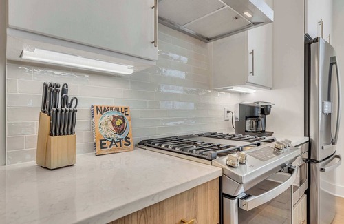* Large chef's kitchen with huge kitchen island and bar stools. Brand new modern kitchen and appliances. Includes all cookware, silverware, dishes, and serving pieces for you to host an intimate dinner or have a cocktail before going out to explore Nashville!