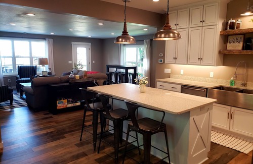 On a dead end road, this property is extremely private for families. It is a completely remodeled home with 3 bedrooms in the main house along with a separate bedroom and bathroom space in the renovated garage living space with 2 twin beds. The detached living quarter space has its own bathroom, small private patio and sliding door to the lake (this rustic detached space is ONLY available mid May-mid October as it's otherwise winterized.)