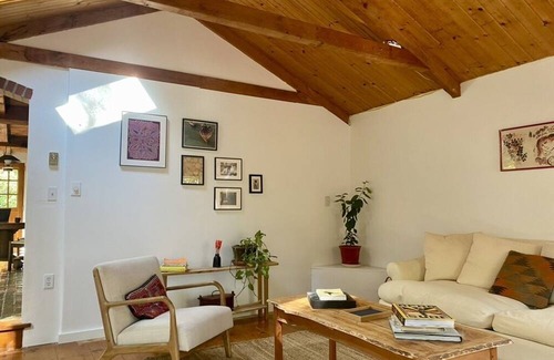 One large primary room with a queen-sized Casper mattress, sitting area, and dressers. The french doors open to a small porch area overlooking the garden