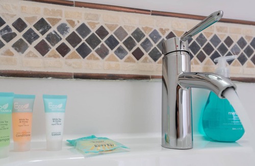 There are also a small closet and hangers for your clothing, bedside lamps and seating area. The bathroom includes towels and toiletries, and also a bathtub with rainfall showers and vanity cabinets with mirrors.