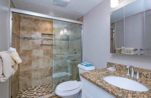 Suitable for either long or short stays and with a quick and easy walk to the beach, with its world class shelling, or to the refreshing pool, this unit sleeps six and is tastefully decorated, freshly painted and with wood-tile floors throughout. Well-stocked kitchen with all expected appliances, plenty of counter and cabinet space and tray lighting and fan. Washer and dryer in the unit. The living area is decorated in beige-blue-green theme with conversational seating for six. Free WiFi, Cable TV and NETFLIX in each room with elevated flat panel TV in the master bedroom and in the guest bedroom there is a Genesis 40 game console for the kids (young and old). Other entertainment options include a closet loaded with board/card games for all ages for those infrequent rainy afternoons. Comfortable bedroom furniture with new mattresses including a king bed in master and moveable twins in guest bedroom. Both bathrooms recently remodeled with walk-in rain shower in master bathroom. Ceiling fans in all rooms. Beach chairs and other beach amenities supplied. Screened lanai with chairs and table for coffee/tea and relaxation, especially in the early morning and early evening.