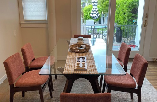 In the Dining Room, an elegant glass table is provided with seating in rosehip fabric chairs for up to six people. Our garden blooms flowers all season so you may feel free to snip a few flowers to adorn your table during dinner.
