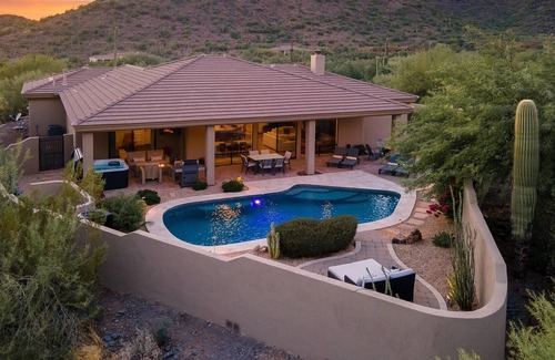 Located in the beautiful Sonoran Desert surrounded by Saguaro Cacti, we welcome you to our luxurious oasis in Cave Creek, which borders North Scottsdale and backs up to Black Mountain. Walk to the nearby trailhead for one of AZ's best and scenic hikes! Stroll into town to enjoy Cave Creek/Carefree’ s night life, fabulous restaurants and shopping. Our luxury property is the perfect retreat for families, or anyone looking for a relaxing getaway. Our property features an evening shaded backyard with something for everyone, including a heated pool (+$125/night - please request at least one week before arrival), spa, peaceful waterfall, BBQ , and outdoor TV. Gorgeous sunsets from guest suites with Walkouts to patios. Exceptional floorplan. Primary suite on one end with all other large guest suites on north end. 4 bedrooms and 2 1/2 bathrooms. All new designer furnishings and accessories. For entertainment, there's a game room located in the garage with a ping pong, air hockey, and a basketball arcade game, offering hours of play time for all ages! Luxury at its finest. Please note there are no pets allowed at this vacation rental.