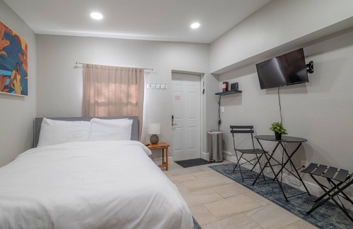 This efficient ground floor studio unit in The Urban Standard Complex features a kitchen that will accommodate home cooked meals, and a cozy, shaded outdoor seating area that overlooks the surrounding garden oasis. Known for its updated bathroom, and wonderful shower, this unit also includes a dedicated closet space that will work for a long- or short-term stays. The unit also includes a TV and dining table. Step outside to the beautiful, shared garden area with outdoor seating, a pet restroom area, and your dedicated parking space only steps away. This unit is centrally located in St. Pete, only 6.5mi to the famous St. Pete Pier with tons of shopping and dining. You will be Less than 10 mi to St. Pete Beach, Treasure Island, and Maderia Beach. A great place to call home for you and your pet for a fun beach weekend or a long-term stay. Please inquire about large group rentals as we have several units.