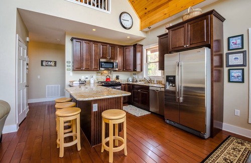 The main level of Thistle Do Nicely offers an open kitchen, a dining area, and a great room with vaulted tongue-and-groove ceilings and endless mountain top views from a wall of windows! The Kitchen has granite counters, custom cabinets, and stainless appliances. The central bartop also offers four bar stool seats for additional dining. The open dining area features a banquet-style dining table with seating for 6 guests. There are two extensions for the table in the master bedroom closet to add more space and seating. The great room boasts a stone wood-burning fireplace, big screen QLED Smart TV, leather reclining furniture, and a custom coffee table. A half bathroom also serves the main level.