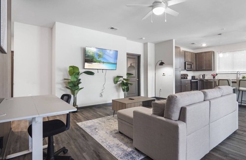 Stay in style in the eclectic city, ranked among the "Best Places to Live" by Money Magazine—Raleigh. This classy 1590-square-foot (~148-square-meters) 3-bedroom, 2-bathroom apartment features a King Bed + 4 Plush Full Beds for your comfort, Lightning Fast Wifi, a Height Adjustable Standing Desk, a Fully Equipped Kitchen, and other Lux Amenities—specially designed for your longer length stays! Step out to a lively neighborhood, close to restaurants, cafés, bars, and shops!