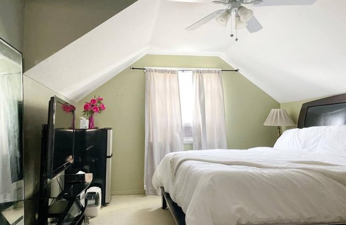 Private house all fenced with private hot tub. The house has three floors: main floors for living room, kitchen, a bedroom (queen bed), a bathroom and a office. Second floor has master bed room (king bed), and a bedroom (trunk bed with full and twin) and a bathroom. Basement has family room (sofa bed) a bedroom (queen bed), an exercise room and a bathroom and laundry room.