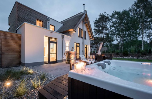 5-star classification by the German Tourism AssociationPets are not allowed in the house or on the property, • The exclusive, reed-covered beach house built in 2016 is located in the 5-star house VAKON Ostseeland in Karlshagen near a nature reserve, about 4 minutes walk from the beach. • Plot approx. 1045 m², living area approx. 150 m² • The heated outdoor whirlpool on the furnished terrace • lovingly furnished with noble maritime decorative elements • underfloor heating in all rooms • Non smoking house with Internet WLAN • large furnished terrace • Ground floor: • Living area with fireplace, large flat screen TV with approx. 1.30 m diagonal and blue-ray player • fitted kitchen with dining table for 6 persons, dishwasher, induction cooker, fridge with freezer, coffee machine, espresso machine, toaster and kettle • infrared heat cabin and heated outdoor whirlpool • Bathroom with og Heated toilet, bathtub, shower and extraordinary shower WC from Grohe • HWR with washer & dryer • Upstairs: • 2 bedrooms with double beds (1.80 mx 2.00 m) and flat-screen TV with about 1.20 m diagonal • 1 bedroom with Double bed (1.80 mx 2.00 m) and flat-screen TV with about 1.20 m diagonal, safe • Bathroom with half-round shower and toilet • Initial supply: bed linen + 2 towels + 1 bath towel p. P. is included, the beds are made upon arrival • 2 parking spaces • Deposit 100 Euro + tax in cash on arrival also long-term visitors are in the months of November to March welcome! We would be happy to make you an offer with favorable special rates.