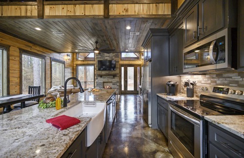 “Beautiful cabin with everything you could need in terms of amenities. The beds were super comfy and the place was spotless. The en suite bathrooms for each bedroom were great. Enjoyed having the indoor and outdoor gas fireplace for our Christmas vacation. I would highly recommend this place.”