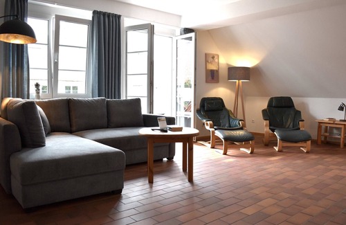 3 room maisonette about 75 sqm for 2-4 persons. 1st floor: living room with a large couch, modern kitchen, bar and dining table, SAT-TV / radio, WLAN, modern bathroom / WC, balcony, 2nd floor: bedroom with double bed, satellite TV, bedroom with 2 single beds, shower / WC