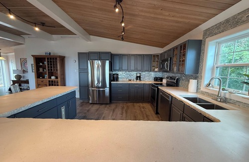 Plenty of space with decor designed for all the comforts of home. The extra large chef-inspired kitchen is loaded with everything you need to cook and enjoy meals. The home can accommodate up to 10 guests; the primary bedroom is on the second floor with a king-sized bed and ensuite bathroom. There are three bedrooms on the first floor; two with queen-sized beds and another with custom-made dual bunkbeds with XL-twin mattresses. The family room has a large sectional couch and Smart TV for those relaxing evenings watching your favorite streaming shows. There is also a chest filled with board games for the kids to enjoy, plus a Foosball Table, Corn Hole game, Jenga, and a Card Table.