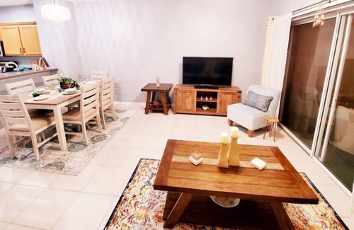 Every detail of this home is designed with your comfort in mind! Long term, it has everything to make you feel like you belong there. Upon entrance, you will find the large kitchen is fully equipped with stainless steel appliances, including a double-door refrigerator with filtered water and an ice maker, stocked Keurig with coffee and tea, toaster, waffle maker, brand new pots and pans, beer mugs, champagne glassware, serving bowls, seasonings, children's cutlery, utensils from ice cream scoopers to chef knives and more. Did I mention the beverage cart? From there you overlook the inviting living and dining area with a touch of Boho throughout. You can enjoy home-cooked meals at the dining table for six or wind down on the couch streaming. There is also a screened in patio if you prefer fresh air. The home features 2.5 baths also fully equipped. You will find endless towels, a variety of toiletries, bath bombs, hair dryer etc. The guest bath has a massaging shower head while the main room has the relaxing rainfall shower head. Each queen bed has a new Serta mattress with the highest rated Amazon sheets. The main bedroom also features a two-in-one vanity and office space. There is a full sized washer and dryer in the hallway laundry closet and two reserved parking spots out front for convenience. There is a walking trail in the community, the neighborhood is quiet but also convenient with tons of restaurants and fun things to do!