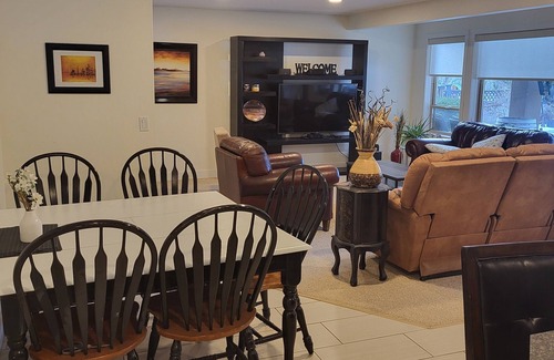 Enjoy a clean, peaceful, private stay with all the amenities of home. A large suite with private entrance only 15 minutes to downtown, restaurants, beaches, golfing, shopping or sports. Explore the Wine Trail minutes away. Relax with a glass of wine on the patio while enjoying beautiful mountain and yard views. The spacious kitchen is fully equipped for home cooking. Perhaps you prefer to BBQ outside on the patio. The beds in our Sea Breeze and Tranquil Oasis bedrooms are clean and super comfortable. Sea Breeze room is bright and spacious and overlooks the yard and mountains. Tranquil Oasis has a double bed with an overhead twin bunk. The recently added full-sized stacked washer & dryer is located in the large walk in closet alongside clothes storage and a small fold down computer desk. The great room is bright & spacious, with plenty of seating. Large ground level picture windows overlook yard & mountain views. Fold down the Lazyboy dual recliner and enjoy Netfix or cable TV on the Smart TV. Open the Tickle Trunk and select a board game, trivia, adult game,puzzle or cards. Soundproofing measures have been taken to help isolate the suite from the main living areas. However, some sound transmission occurs through the adjoining fire door. Water quality from our New water treatment facility is excellent.