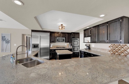 -Sleek and fully equipped kitchen with ample storage space and granite countertops