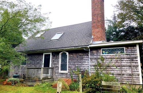 Welcome to our tranquil A-frame cottage nestled in the serene beauty of Vineyard Haven, where you can enjoy destinations like The Black Dog, The Net Result, and Bunch of Grapes bookstore. Located on a quiet, pretty residential street a brief walk from downtown, vaulted ceilings greet you as you enter the living room, which is illuminated by skylights and stained glass windows rescued from a local whaling church. Perfect for artists and those seeking a peaceful retreat, our hideaway offers a serene atmosphere. Unwind amidst nature's embrace, where inspiration flows freely and creativity flourishes. Enjoy the rustic charm and quietude of our space, thoughtfully designed for relaxation and rejuvenation. Whether you're reading, writing, or simply seeking solace, our cottage provides the ideal backdrop for your escape. Discover serenity at our A-frame retreat on Martha's Vineyard.