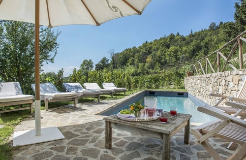 The house is surrounded by a peaceful garden that adapts to the sloping surface of the property and is one with the beautiful setting of vineyards, woods and hills that delimit it naturally. The vegetation composed of lavender bushes, wild roses, jasmine, strawberry trees, herbs and borders of rosemary, which frame the dry stone walls and short stone paths, is the backdrop to the panoramic pergola just outside the living room French windows and to the exclusive pool, the perfect spot from which to admire the beautiful sunset over the Chianti hills.Please notice that photos are taken in spring, therefore flower blossoming, and the colours of the gardens' grass could be different at the moment of your arrival at the villa.