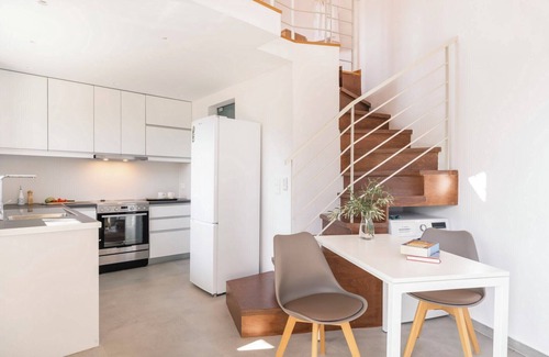 The guesthouse is located at the bottom of the driveway leading up to the main house. Here there is an open-plan living and dining area with a kitchenette, a shower room, and, on an open mezzanine a double bedroom.