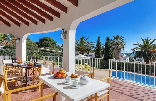 This delightful detached villa is conveniently located within easy walking distance of the lovely sandy beach in Punta Prima along with a good selection of shops, bars and restaurants. The accommodation is all on one level and comprises of four bedrooms, all with air conditioning and an en-suite bathroom, a shower room, separate lounge, dining room and kitchen. Outside there is a spacious covered terrace leading to the sun terrace and large private pool. Patio furniture, sun loungers and a brick built BBQ are available to relax, soak up Menorca’s sun and enjoy ‘Al fresco’ dining at its best.