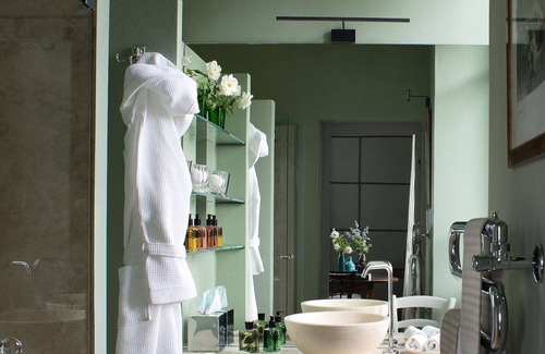 A pleasant hallway introduces guests to 2 spacious and comfortable living rooms, furnished with taste and attention to detail, where ancient and modern come together in elegant and balanced way. Soft colors combined with exquisite items of furniture create great elegance and sophisticated environments that invite relaxation and conversation. On the same floor is a beautiful dining room overlooking the garden, embellished with a long table for meals and framed by a large fireplace that makes it even more welcoming in winter. Following is an efficient and fully equipped kitchen as well as a half bath. The ground floor houses the large master bedroom with its own bathroom equipped with accessories and quality components.