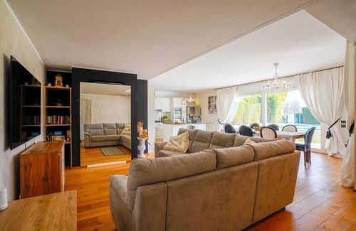 Spacious living room with XXL sofa, 55” flat-screen TV and board games
