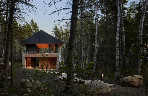 La Villa Luce seamlessly blends into its natural surroundings, nestled between two imposing stone formations. It rises majestically among the trees, offering stunning views from the St. Lawrence River to the shores of La Malbaie. With expansive terraces on either end, it invites guests to take in the enchanting scenery, evolving with the seasons and bathed in captivating light. Inside, the surrounding forest is transformed into a central architectural element, with a grand green volume that guides visitors through the space. The ground-floor bedrooms are nestled between stone walls, creating a subtle harmony between strength and softness. The Villa represents a true fusion of architecture, nature, and human presence, meticulously designed to offer a unique sensory experience.