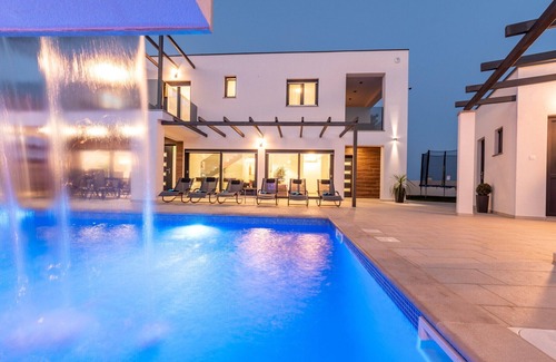 The Villa Luka Loborika is an ultra-modern and as good as new villa in a quiet and private location. The coastal town of Pula, also known for the Arena amphitheater, is about 8 km away. Crystal clear sea water and very clean and wonderful beaches in about 7 km. The domicile is divided into 2 residential units, the main house has a living area, a kitchen as well as 5 bedrooms and 5 bathrooms and 2 more beds on the comfortable sofa bed with mattress. The pool table is in the foyer. The adjoining guest house has a living area, a kitchen, 1 bedroom and 2 bathrooms. The interior is modern and all rooms are equipped with satellite TV, air conditioning, balcony or terrace. The property can only be rented in its entirety and is suitable for up to 14 people. The extravagant, luxurious and very relaxed outdoor area is equipped with, a 50sqm salt water wave pool and massage jets. The swim-up pool bar, which is located under a waterfall, is particularly fantastic. For your physical well-being there is a grill area (outdoor barbecue) with an outside kitchen. The fenced property has 4 private parking spaces and several parking spaces next to the villa. We wish you a relaxing and unforgettable stay. Distances: post office 8000m, emergency room 8000m, discotheque 9000m, hotel swimming pool 9000m, gas station 9000m, restaurant 1000m, shop 1000m, center 8000m, sea 8000m, beach 8000m, airport 3000m.