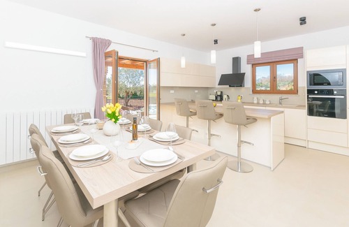 The villa consists of two floors, but only the ground floor is rented while the first floor is closed. All rooms are on the ground floor, which consists of 3 double bedrooms, 3 bathrooms, one with bath and two with shower, and an open plan living area with fully equipped kitchen and dining area. In one bedroom there is an extra bed for one additional person upon request. There is also a modernly equipped tavern with a fireplace, dining table and benches perfect for family meals.