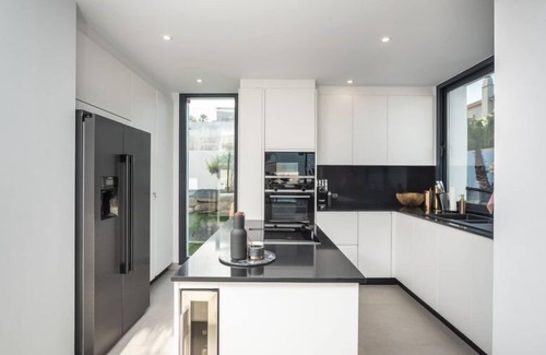 Urbanización La Paloma 9 km from Marina de Sotogrande: Beautiful, luxurious house "Villa Morris", 3 storeys, detached, built in 2023. In an elevated position residential area (villas), 1.5 km from the sea. Private: property 1'250 m2 (fenced) with beautiful garden to relax, swimming pool angular (8 x 5 m, depth 120 - 160 cm, seasonal availability: 01.Jan. - 31.Dec.) with internal staircase. Hot tub, terrace, garden furniture, barbecue. In the house: internet access, hot tub, air conditioning, burglar alarm system. Linen change weekly. Towel change weekly. Room cleaning weekly (included). Parking on the premises. Supermarket 4.8 km, shopping centre 10.5 km, restaurant 1.6 km, café 600 m, bus stop "Bus Stop Duquesa West, N-340," 6 km, railway station "Estación de tren Algeciras" 37.5 km, sandy beach "Playa de Las Arenas" 1.7 km. Sports harbour 6 km, marina 8.3 km, golf course (18 hole) 6.6 km, sailing school 10.2 km, tennis 9.4 km, minigolf 12.6 km, riding stable 10.8 km. Nearby attractions: Gibraltar 33.8 km, Puerto Deportivo Sotogrande 8.3 km, The Estepona Old Quarter Casco Antiguo 18.6 km, Ciudad Romana de Acinipo 102 km, Ciudad de Ronda 83.4 km, Tarifa Beach 59.2 km. Hiking paths: El Caminito del Rey - Acceso Norte 118 km. The jacuzi is heated to 32ºC all year around. The villa counts with numerous luxurious features such as chill out area, pergola with two hanging chairs, pool terrace, Gas BBQ area, Sonos speaker.