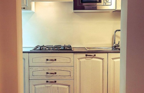 The first living room is paved with terracotta tiles. The ceiling has characteristic exposed wood beams and terracotta tiles. The furnishings are warm and welcoming, and include an armchair and a divan that unfolds into a double bed (140 cm/55 inches). There is a nice fireplace. In the living room you will also find a cooking area. The kitchenette is equipped with a four-burner gas cooker, a small refrigerator without freezer, a dishwasher, a microwave oven, an Italian-style coffee-maker and a kettle. The dining table can accommodate four guests. In this room you will find a satellite smart TV. From the living room you will be able to enter the garden through a French door. The room also has a window, as well as a small high window. It is equipped with underfloor cooling.