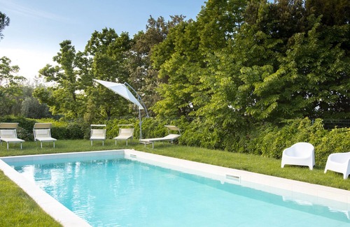 The attractive swimming pool is located at the back of the villa, within the garden. It is reachable from the entrance door of the villa, down stone steps, or from the basement sitting room. The rectangular pool measures 12,5 x 4,5 m with a variable depth of 1,25 to 1,75 m. The pool is lined with white tiles and has salt purification and a cold-water shower. Access to the water is via large steps and the sunbathing area is equipped with sunbeds, chairs and an umbrella. The pool is available from the last Saturday of April to the first Saturday in October.